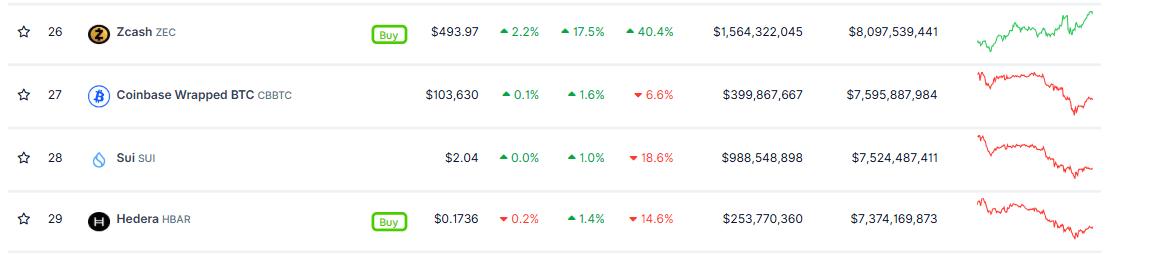 Zcash迄今已飙升超过17%。本星期截至周四发稿时,ZEC 的价格已接近 500 美元大关。CoinGecko 的数据显示,ZEC 的市值已飙升至 80 亿美元以上,在整个加密货币市场中排名第 26 位,超过了 SUI 和 HBAR 等热门山寨币。