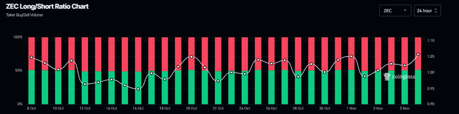 此外,注重隐私的多空比率加密货币周四,该比率报1.05,接近月度高点。该比率高于1,反映出市场看涨情绪,因为更多交易员押注ZEC将上涨。