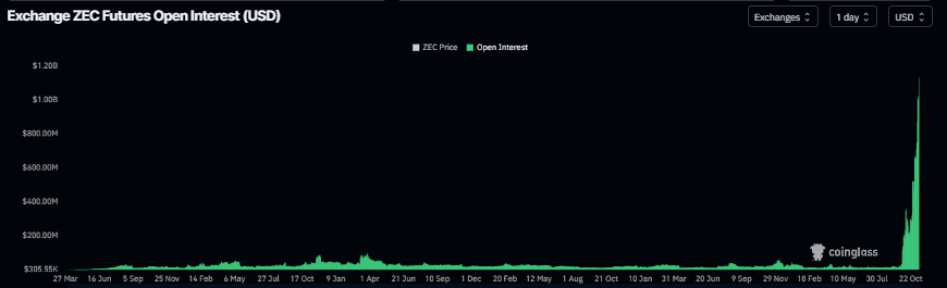 CoinGlass的数据显示,周一交易所ZEC期货未平仓合约(OI)飙升至11.3亿美元的历史新高。OI的上升意味着有新的资金或额外资金进入市场,这可能导致ZEC价格的持续上涨。