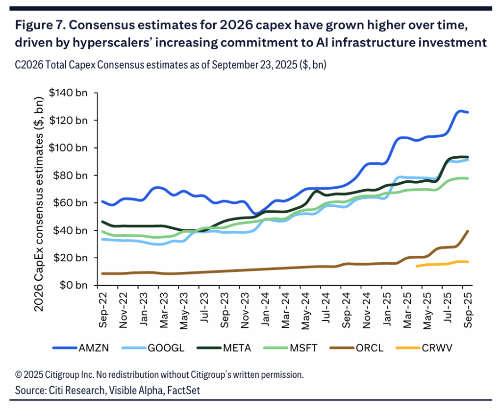花旗指出,上调后的2026年资本开支增长预期为24%,显著高于目前20%的市场共识。报告预计,各大科技巨头将在第三季度业绩指引中反映这一增量支出,整个AI基础设施产业链,包括半导体、硬件及其他基础设施供应商,都将从这轮加速投资中受益。