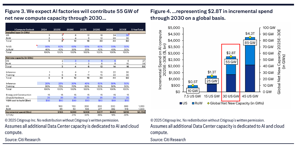 与此同时,花旗强调这轮AI投资浪潮与互联网泡沫存在本质区别。当前企业对AI服务需求的快速增长为投资提供了"明确的外部验证",为投资循环创造了关键的“出口”。花旗估计,到2030年AI算力需求将新增55GW全球电力容量,带来2.8万亿美元的增量AI算力支出。