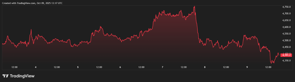 以太坊目前的交易价格约为 4,350 美元,这得益于其主导的市值、强大的网络效应以及在 DeFi 和智能合约生态系统中根深蒂固的地位。它的优势依然明显,广泛的开发者活动、质押需求以及广泛的基础设施采用使其始终处于加密货币领域的核心地位。然而,4,800-5,000 美元之间的阻力位屡屡限制了上涨行情,鲸鱼获利了结(包括最近 7,200 万美元的抛售)常常引发动能转变。