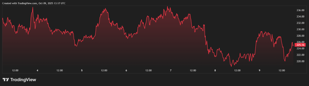 Solana 以其速度快、交易成本低而闻名,仍然是 NFT、游戏和 DeFi 活动的主要枢纽。目前,其交易价格在 200 至 230 美元之间,220 至 245 美元是直接阻力位,而长期上限接近 250 美元。分析师认为,210 至 230 美元区域是动能争夺的关键战场。