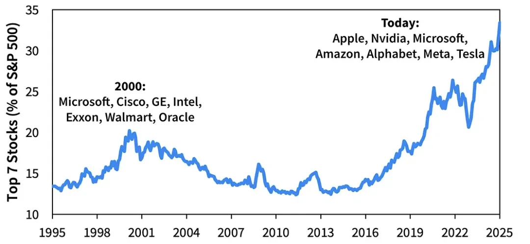 图表显示了标准普尔 500 指数在每个时间点前7只股票的总权重。