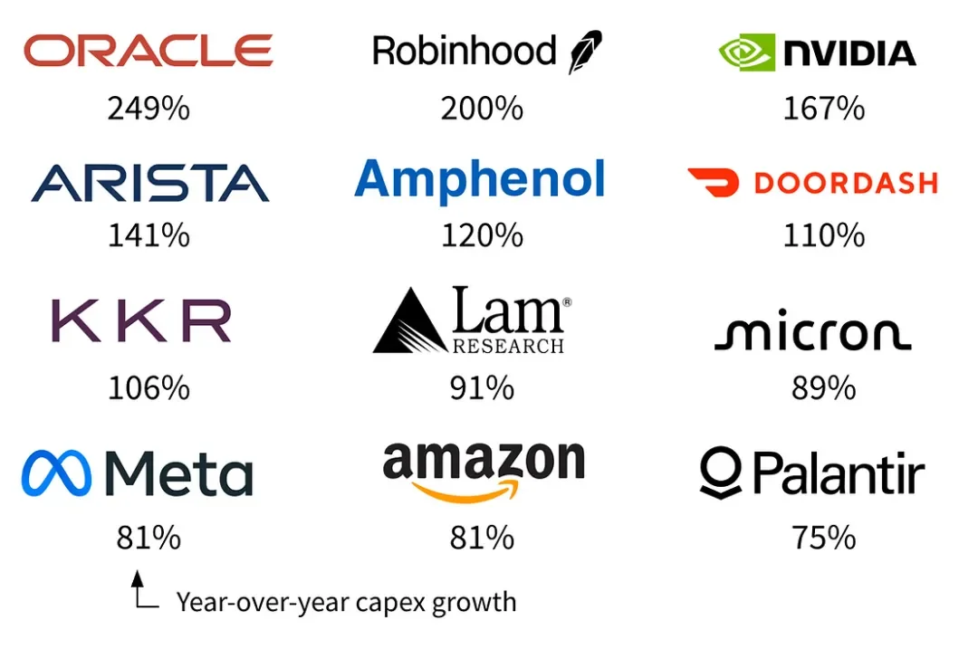 这些股票大多与人工智能相关。甲骨文一直在签署巨额人工智能云交易,位居榜首,过去一年资本支出增长了 249%。我们发现 Magnificent 7 的中坚力量 $英伟达(NVDA.US)$ 、 $Meta Platforms(META.US)$ 和 $亚马逊(AMZN.US)$ ,以及网络和半导体公司 $Arista Networks(ANET.US)$ 、 $安费诺(APH.US)$ 、 $泛林集团(LRCX.US)$ 和 $美光科技(MU.US)$ 。 $Palantir(PLTR.US)$ 是人工智能的重度用户,跻身前 12名。