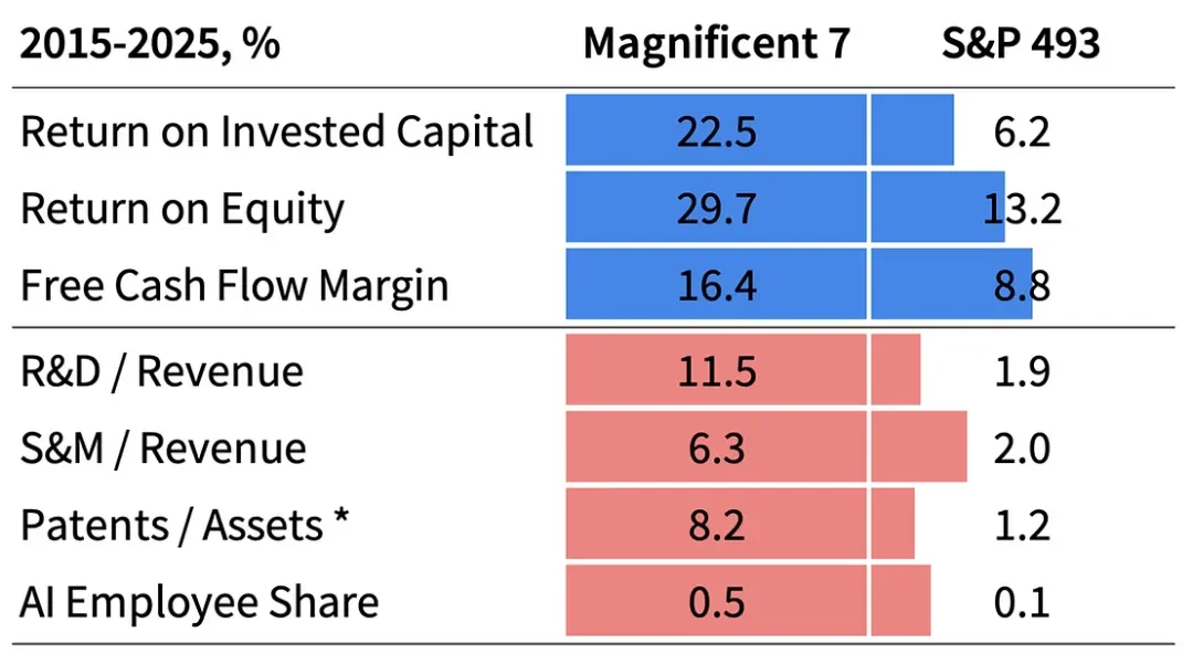 Magnificent 7 的非凡成功得益于其轻资产商业模式。通过利用知识产权、品牌资产、人力资本和网络效应等无形资产,这些公司无需大量资金即可产生巨额回报。