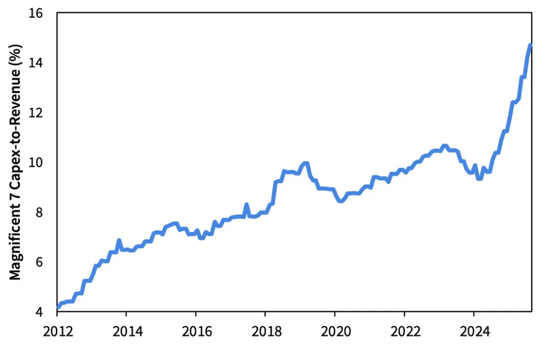 然而,Magnificent 7 现在正在放弃推动他们过去成功的轻资产模式。自 2012 年以来,资本支出已从收入的 4% 飙升至 15%。对投资者来说不幸的是,人工智能军备竞赛正在将这些公司从轻资产转变为重资产公司。