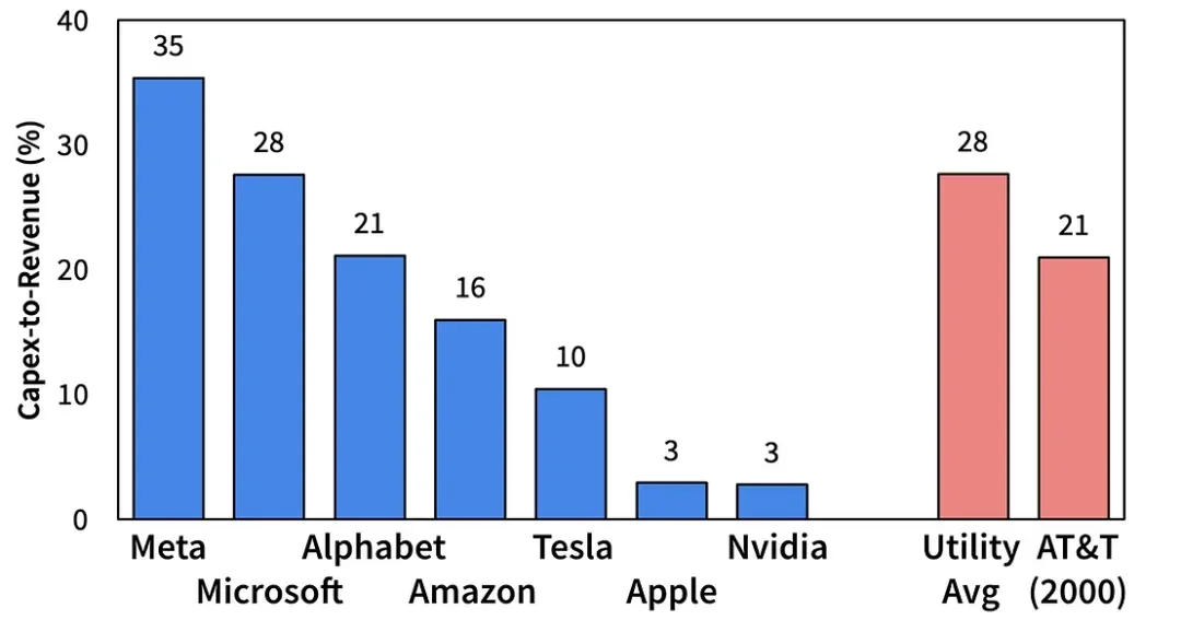 Magnificent 7 的资本密集度正在迅速接近公用事业,这是资产最重的行业。正如下一个展览所示, $Meta Platforms(META.US)$ 、 $微软(MSFT.US)$ 和 $谷歌-C(GOOG.US)$ 都将将其收入的 21% 至 35% 用于资本支出,超过当今全球平均公用事业公司和电信泡沫鼎盛时期的 AT&T。