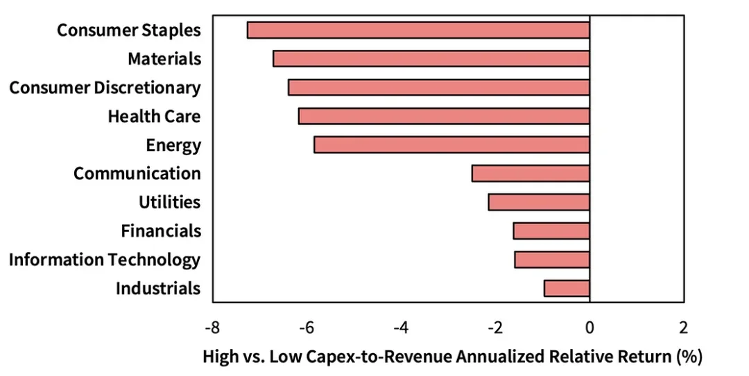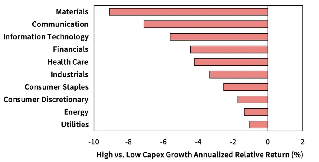 在所有十个行业中,开展最大资本支出活动的公司往往表现落后于更保守的行业同行。值得注意的是,我们看到材料的影响比通信更强,尽管后者行业是互联网投资不当的中心。
