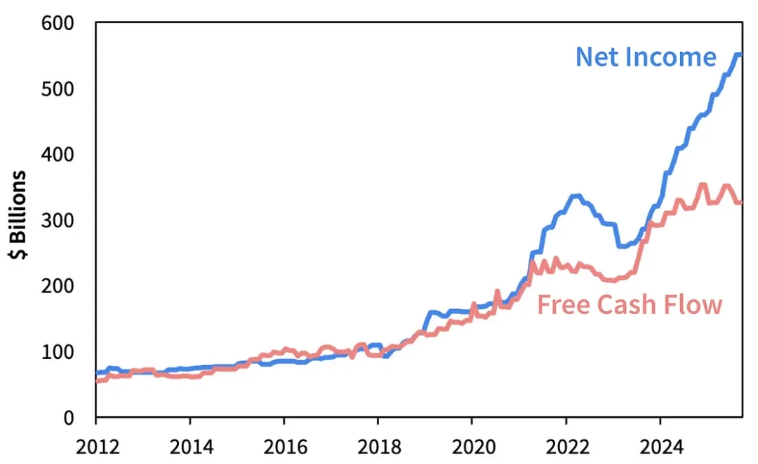 尽管 Magnificent 7 仍然拥有出色的资产负债表,但他们越来越多地与 OpenAI、CoreWeave 和 Oracle 等财务状况较差的公司纠缠在一起。此外,随着自由现金流的减少,他们开始转向债务融资。例如,Meta 最近获得了 270 亿美元的表外债务,用于建设其 Hyperion 数据中心——这是有史以来最大的私人信贷产品。