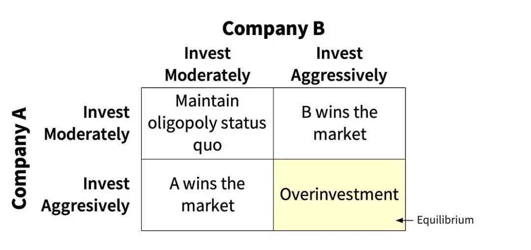 人工智能军备竞赛类似于经典的“囚徒困境”博弈论问题。虽然最佳举措是企业双方同意缓和其人工智能投资,以保持其寡头垄断,但这种平衡是不稳定的,因为每家公司都被激励单方面增加投资以占领市场;如果 OpenAI 全力以赴,其余公司就不能坐以待斃。这导致了次优平衡,即所有公司都积极投资,即使这会导致过度投资和集体利润池的破坏。