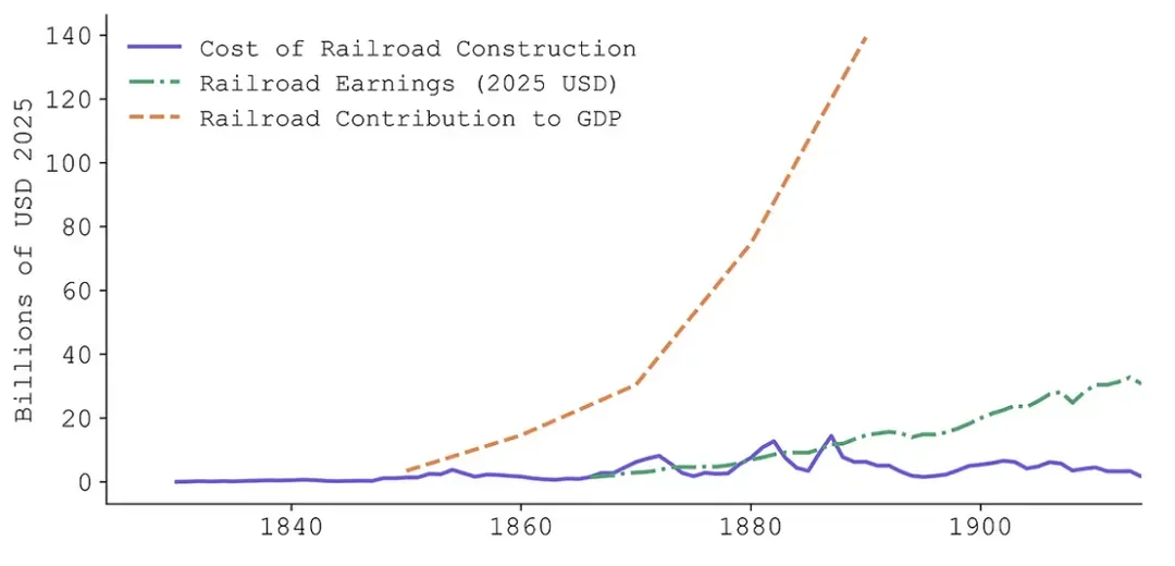 然而,虽然宾夕法尼亚中央大学和全球十字路口可能失败了,但他们建设的基础设施促进了大规模的经济增长。正如下一个展览所显示的那样,在经历了许多投资者的坎坷几十年之后,铁路业终于站稳了脚跟。然而,即便如此,他们赚取的利润也只是所创造的整体经济价值的一小部分(参见 Azhar 和 Warren (2025))。