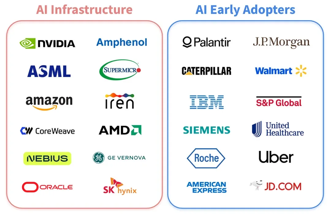 下一个展览为每个类别提供了一些示例。在人工智能基础设施方面,我们找到了英伟达、ASML、Nebius、Supermicro、IREN、GE Vernova 和 SK 海力士。同时,人工智能的早期采用者不仅包括 Palantir 和 Uber 等数字原住民,还包括卡特彼勒、沃尔玛、摩根大通、西门子、罗氏和标准普尔等传统行业的早期采用者。
