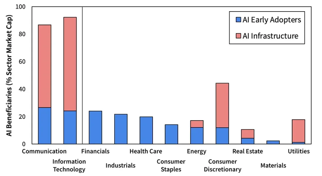 人工智能基础设施公司主要集中在通信、技术和非必需消费品领域,但在公用事业、房地产和能源领域也有较小的影响力。相比之下,人工智能早期采用者在各个领域分布更为均匀,他们在通信和科技领域的权重并不比金融、工业和医疗保健高多少。