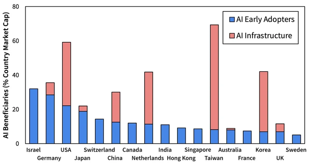 接下来,我们来看看哪些国家对AI受益人的配置最高。下一个图表显示了这两个群体在每个国家的市值中所占的份额。