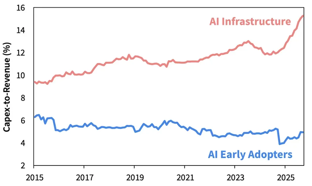 虽然人工智能基础设施公司的资本密集度一直较高,但随着时间的推移,这种差距不断扩大,随着超大规模企业开始了数万亿美元的人工智能资本支出狂欢,这种差距在过去一年中爆发式上升。这令人担忧,因为如前所述,重资产公司通常利润较低。