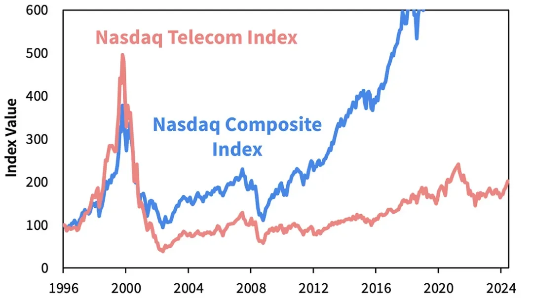 例如,美国铁路扩张因 1873 年和 1893 年的恐慌而中断,数百家铁路公司破产。同样,在 2000 年互联网泡沫破灭之后,电信股指数暴跌 -92%,即使在 25 年后仍未恢复。