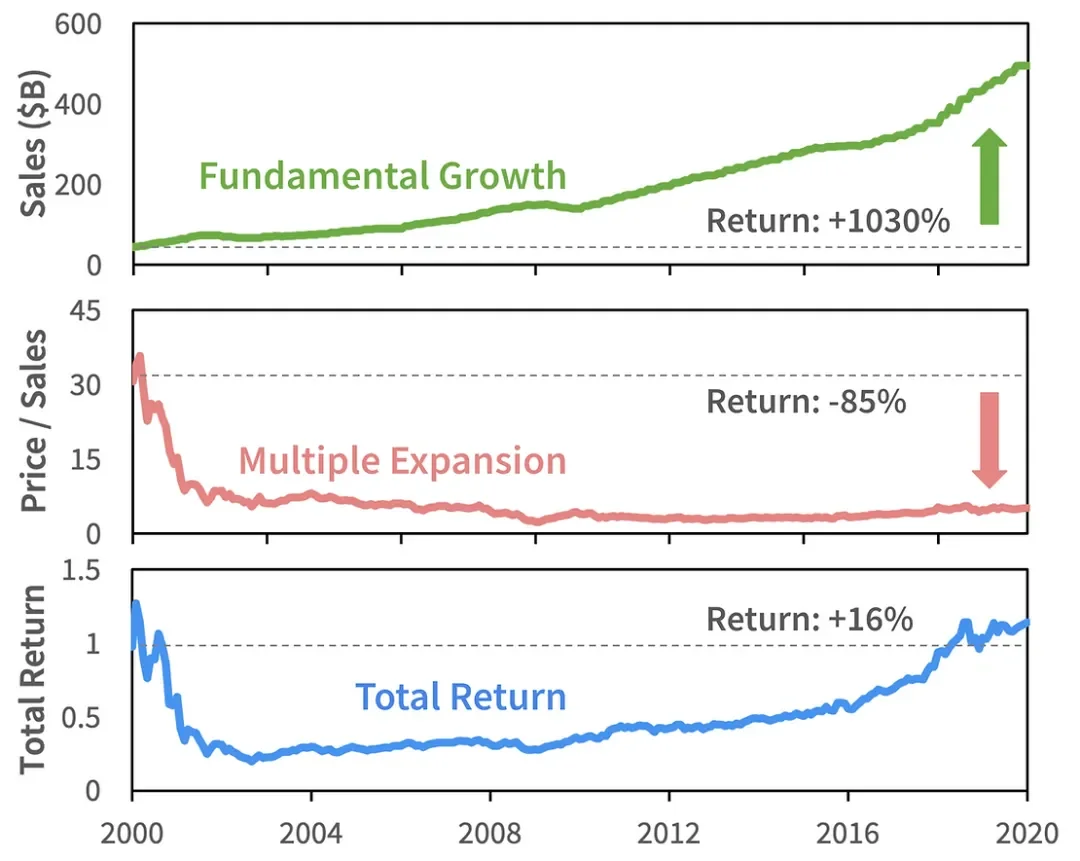 就总回报而言,这些多重压缩造成的严重损失足以抵消强劲的基本面增长。到 2002 年,投资者损失了 80% 的资金。虽然这些互联网宠儿最终确实成长为泡沫倍数的顶峰,但这花了令人痛苦的漫长 18 年。