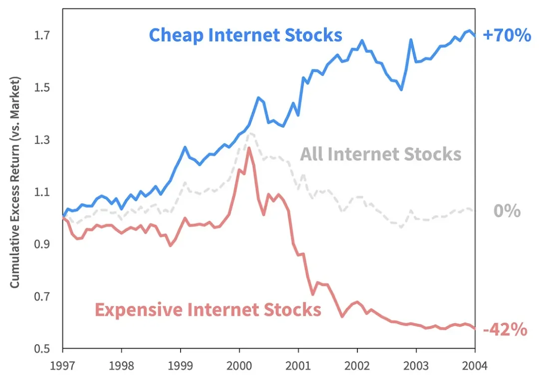 在此期间,全互联网股指相对于大盘经历了往返。然而,将指数分为便宜和昂贵的两半揭示了明显的分歧。廉价的互联网股票实际上在繁荣和萧条时期始终跑赢股市。然而,它们的优异表现被昂贵的互联网股票的表现不佳完全抵消。