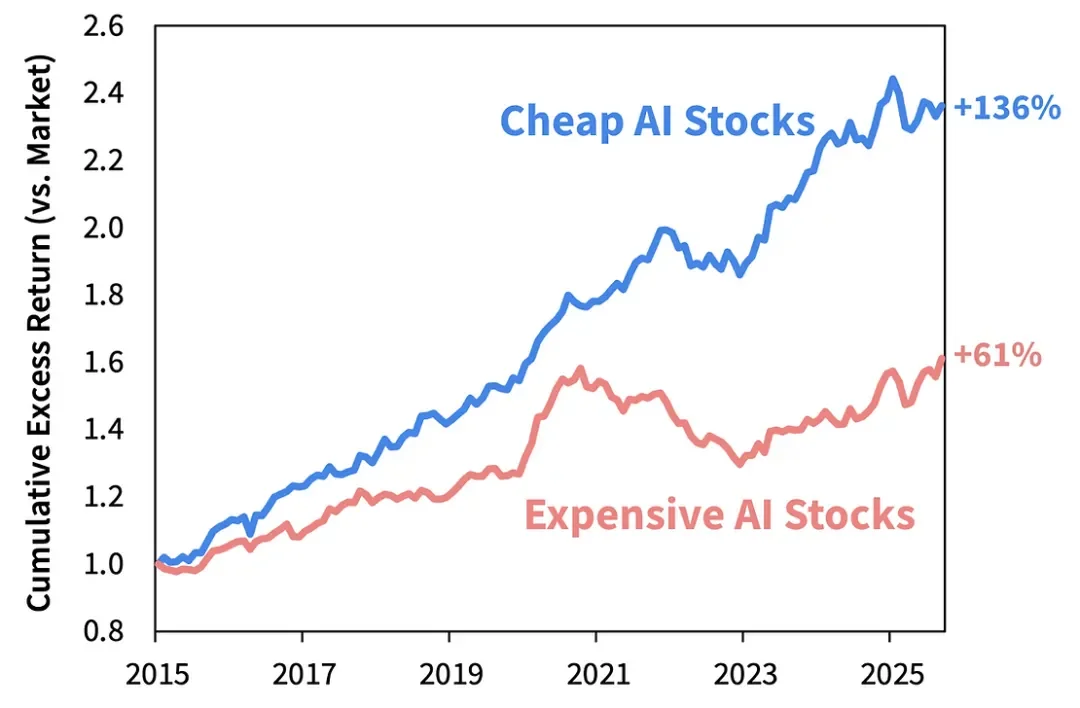 最后,让我们来看看便宜和昂贵的人工智能股票相对于大盘的历史表现。和以前一样,我们将 AI 股票领域分为便宜和昂贵的两半,每月重新平衡一次。
