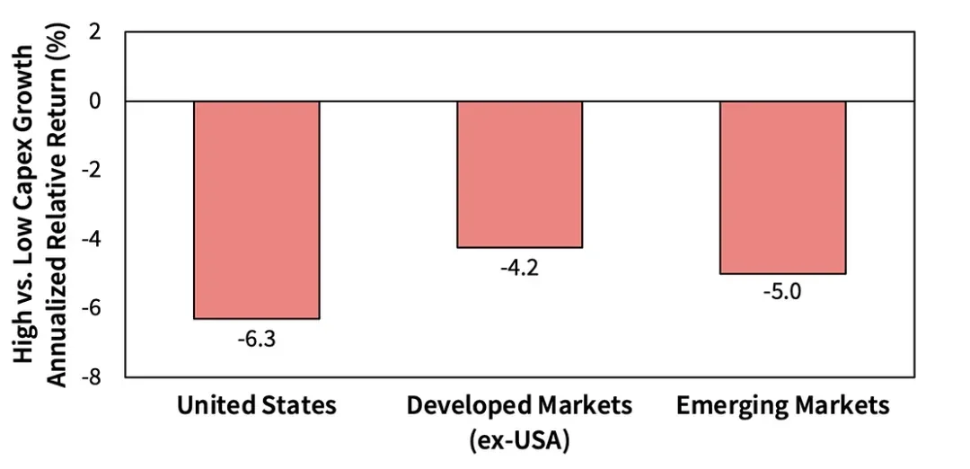 最后,我们在美国以外的地方找到了这种现象的证据。下一个展览记录了主要股票地区不断增长的资本支出公司的表现不佳。