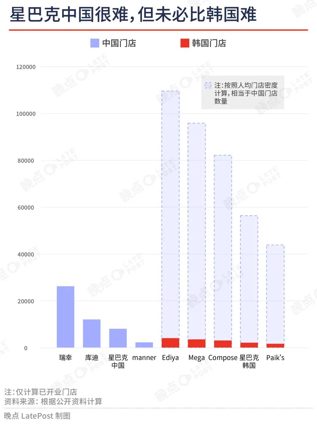 在 5100 万人口的韩国,星巴克开了 2050 间店。如果不考虑收入水平,只看人口总数,星巴克中国要开到 5.6 万家,超过蜜雪冰城,才能达到星巴克在韩国的门店密度。