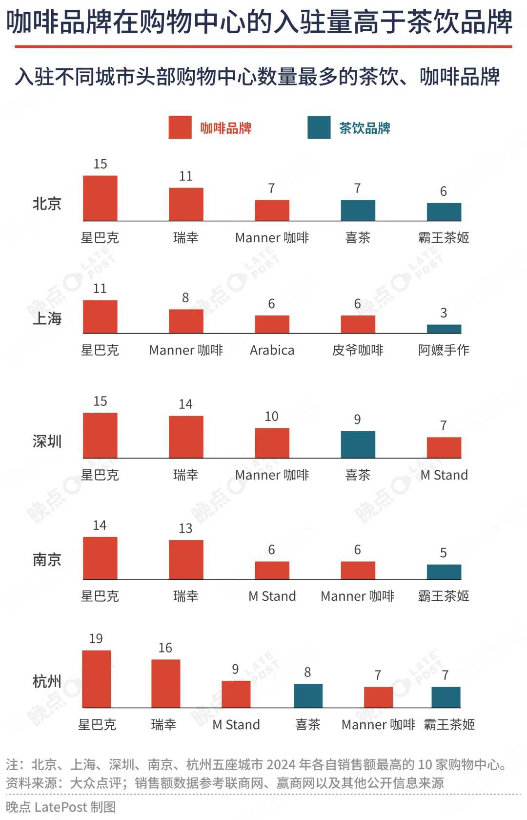 《晚点 LatePost》统计发现,星巴克依然是核心购物中心首选饮品品牌。和我们一年前的统计比较,星巴克在核心购物中心的入驻率从 82% 增加到 90%,意味着它开了更多的店。首层率维持在约 35%,并依然是入驻购物中心最多的咖啡、茶饮品牌。