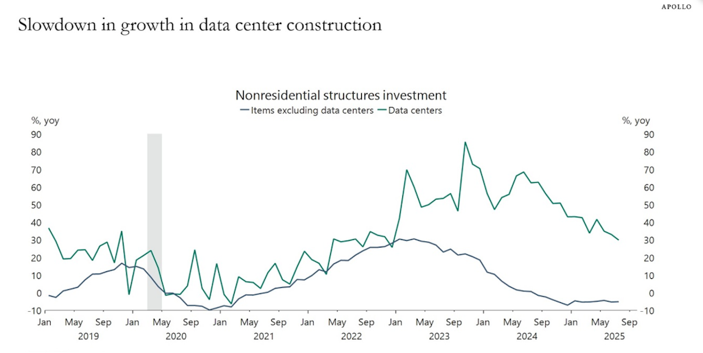 托斯滕·斯洛克笔记对数据中心的投资仍在增长(而且增长速度很快),只是增速放缓了。我猜测是发电能力跟不上需求。(在太空领域就不会出现这种问题。)