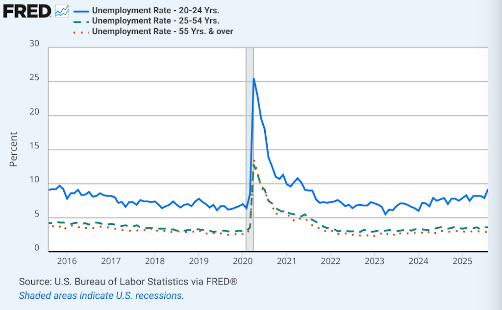 年轻劳动者或许需要美联储的帮助。美国劳工统计局上次收集数据(早在8月份)时,20至24岁人群的失业率已升至9.2%。
