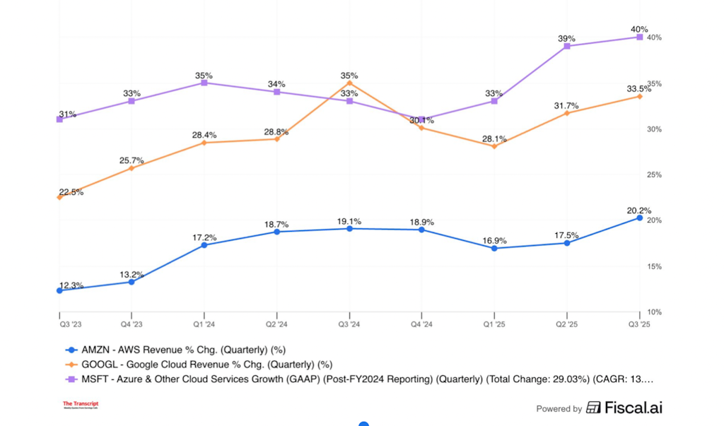 本季度亚马逊、谷歌和微软的网络服务增长率均有所上升。然而,这些年营业额已达数百亿美元的企业,原本就难以维持两位数的增长率,更遑论更快的增长。