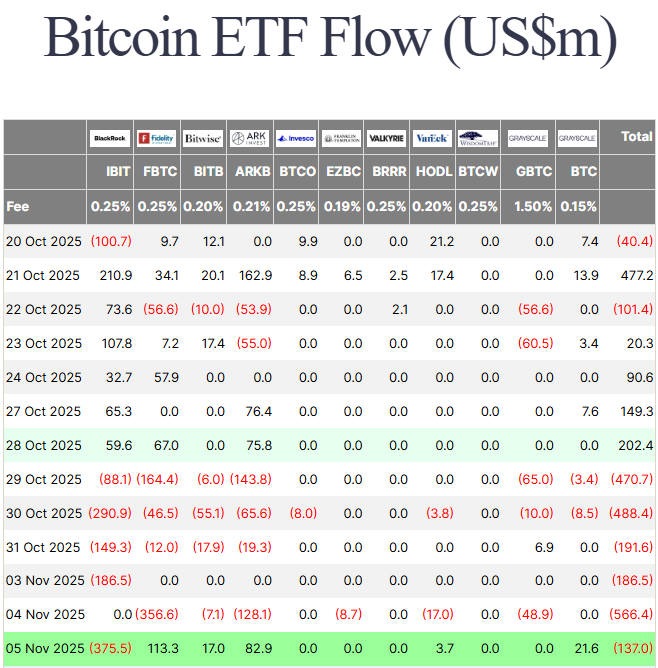 美国现货比特币ETF在11月5日星期三录得1.37亿美元的资金流出。这标志着连续六天流出投资工具的这种特性持续对交易员的情绪造成压力。