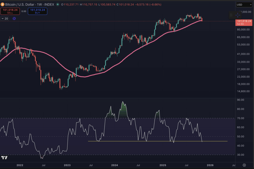 如果比特币价格收盘价低于目前 50 周均线水平(接近 102,000 美元),Martinez 警告称可能会出现 60% 的回调,预计下行目标价位在 40,000 美元左右。
