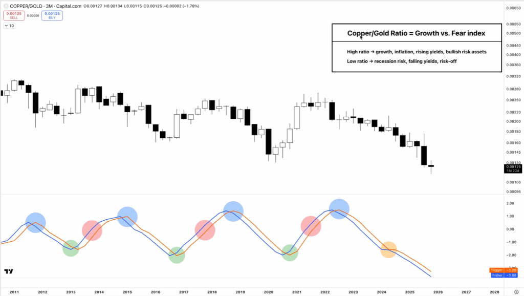 塞韦里诺认为,四年一次的减半说法充其量是不完整的,最坏的情况是,这种说法是错误的。他将之前的减半日期与……Fisher变换信号他分析了铜金比率,并指出真正的转折点历来都是宏观因素驱动的,而非供应驱动。“我从来没真正认为是减半造成的,”他说。“同样的减半日期也开启了纳斯达克的牛市……比特币的减半实际上不会对科技股产生任何影响。”在他看来,减半只是与铜金比率的上涨以及风险偏好情绪的上升同时发生,而非导致其上涨,而这种风险偏好情绪通常会推动比特币突破前期高点,进入最后的抛物线式上涨阶段。