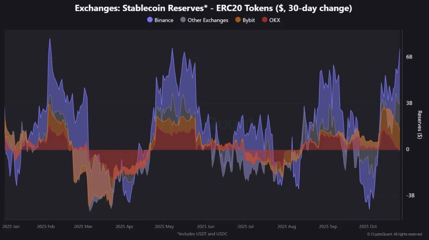 加密货币分析师 Maartunn 指出,稳定币存款的激增可能反映出交易员重新燃起的“逢低买入”情绪,将资本投放到交易所以进行潜在的积累。