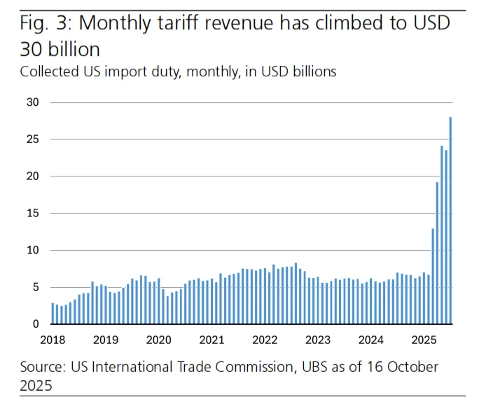 根据瑞银的推演,若最高法院最终裁定关税非法,最直接的后果是美国政府或需退还约1300亿至1400亿美元的关税收入。这笔资金将为支付了关税的美国进口商带来一笔意外之财,但同时也会使本已严峻的联邦预算赤字状况进一步恶化,相当于2025年预算赤字的7.9%。