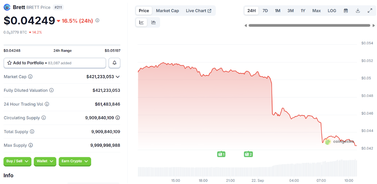 Brett 已成为 Base 区块链的非官方吉祥物,其灵感源自漫画人物“男孩俱乐部”。目前,Brett 的交易价格约为 0.042 美元,市值达 5.13 亿美元,已成为 Base 最具文化相关性的 meme 代币。